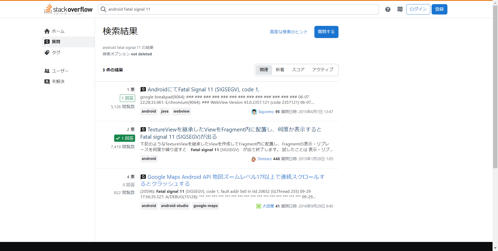 画面上部の検索窓に『android Fatal signal 11』と入力して検索します。
