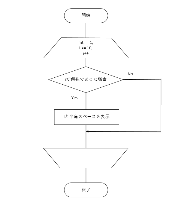 今回は、int型の変数iが1から10の間ループし、偶数であった場合に表示するプログラムのフローチャートです。