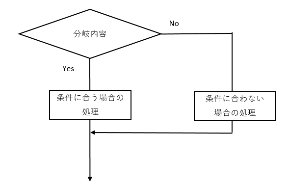 ひし形の下に伸びる矢印の先に条件に合う場合の処理を記述し、ひし形の右に伸びた矢印の先に条件に合わない場合の処理を記述します。