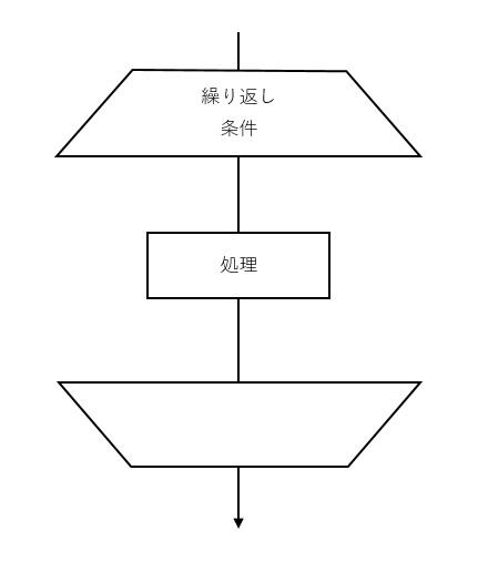 - ループは台形で挟むことで表します。開始時は上辺が短い台形で、終了時は下辺が短い台形で示します。